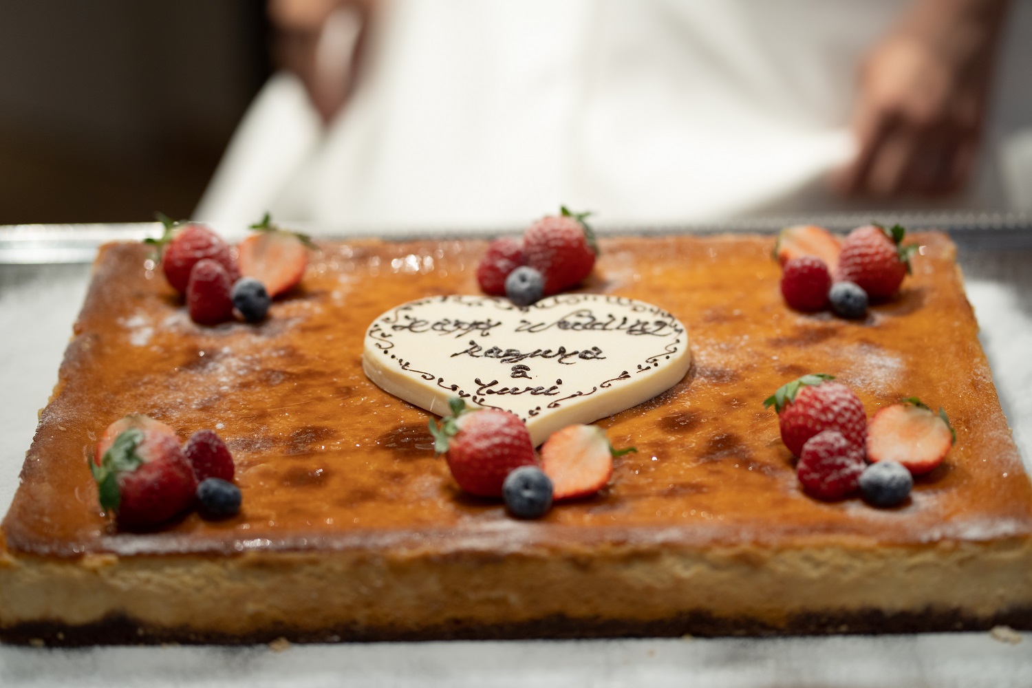 披露宴が始まり、まずはチーズケーキのウエディングケーキに入刀