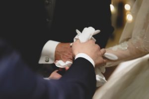 ゲストに見守られながら、新婦お父様と新郎様のバトンタッチ