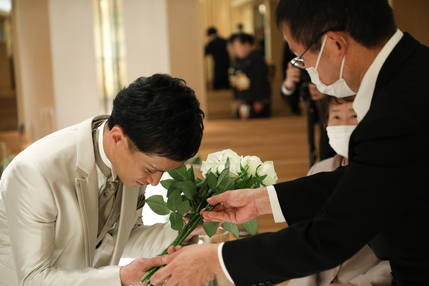 何やら新郎様の手には花束が💐