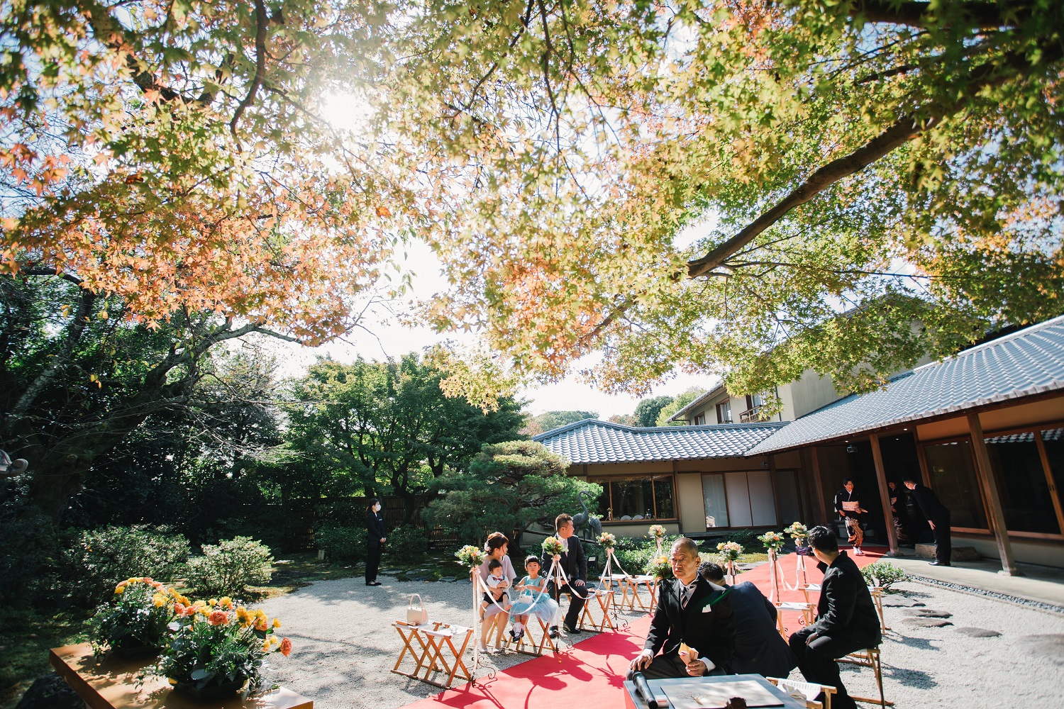 日本庭園の紅葉が綺麗に色づく中、