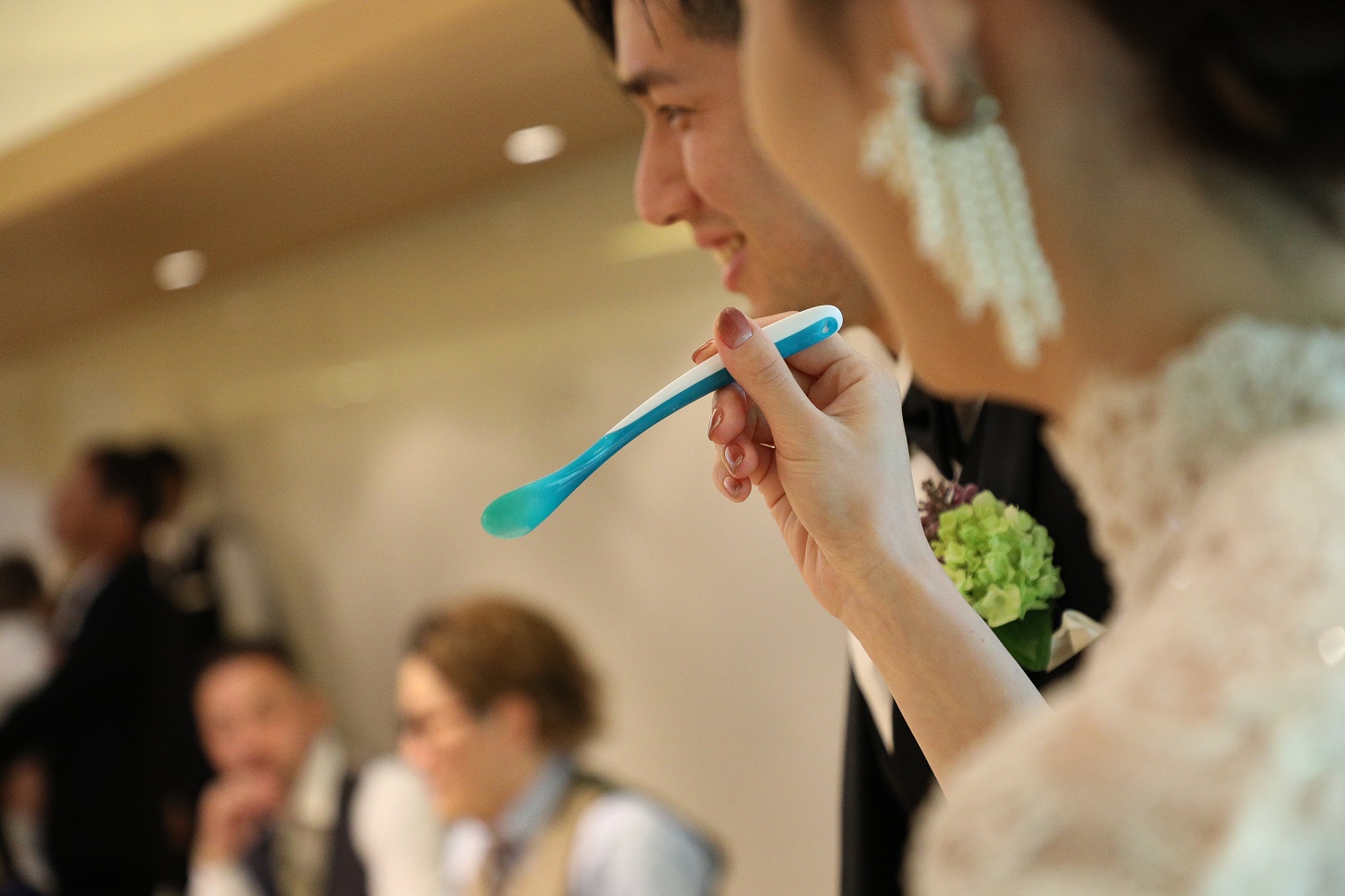 披露宴の定番ケーキ入刀からのファーストバイトでは、